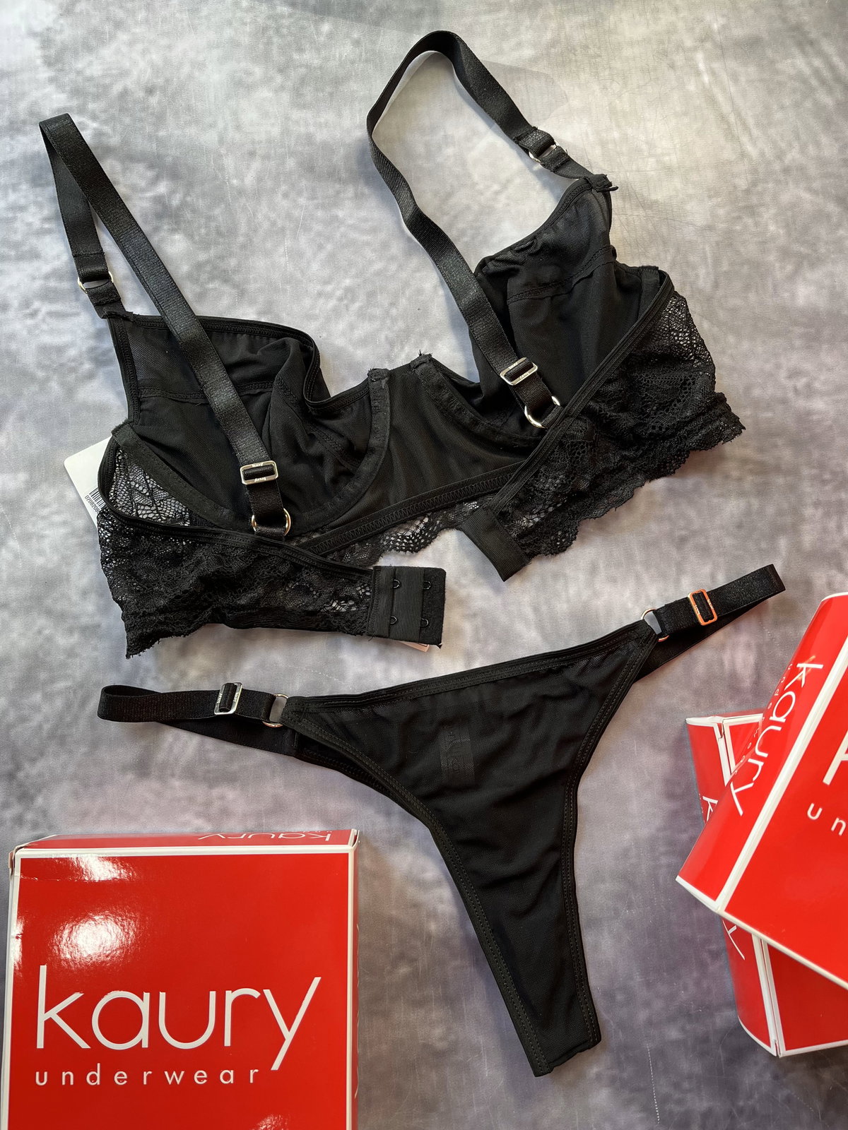 Conjunto de encaje y tul con aro, corpiño doble forro y less regulables ambos con breteles anchos