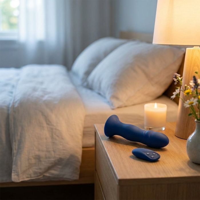 Este vibrador anal con una leve curvatura texturada y con diseño de glande. En su parte inferior posee ventosa y control remoto inalámbrico.