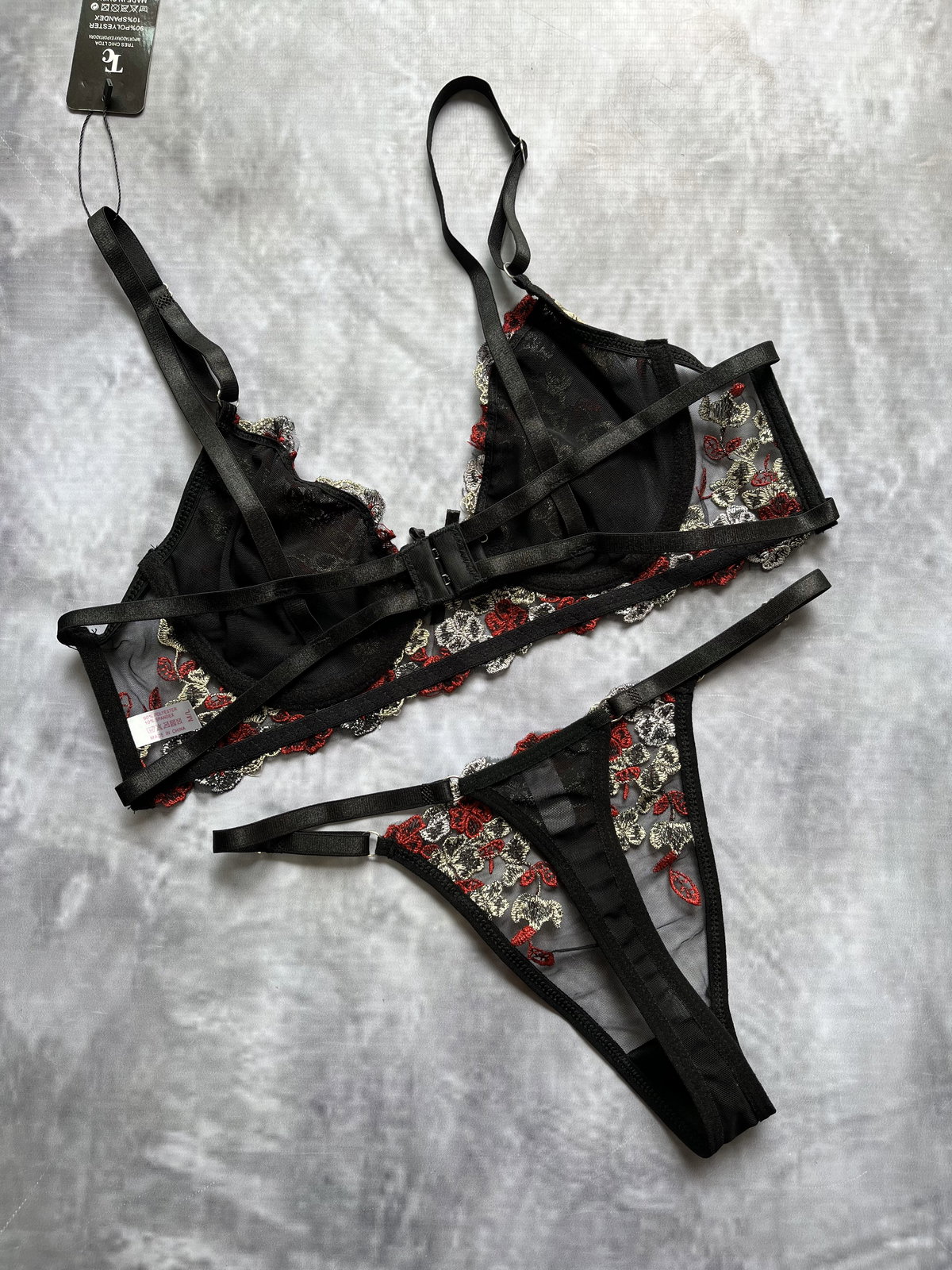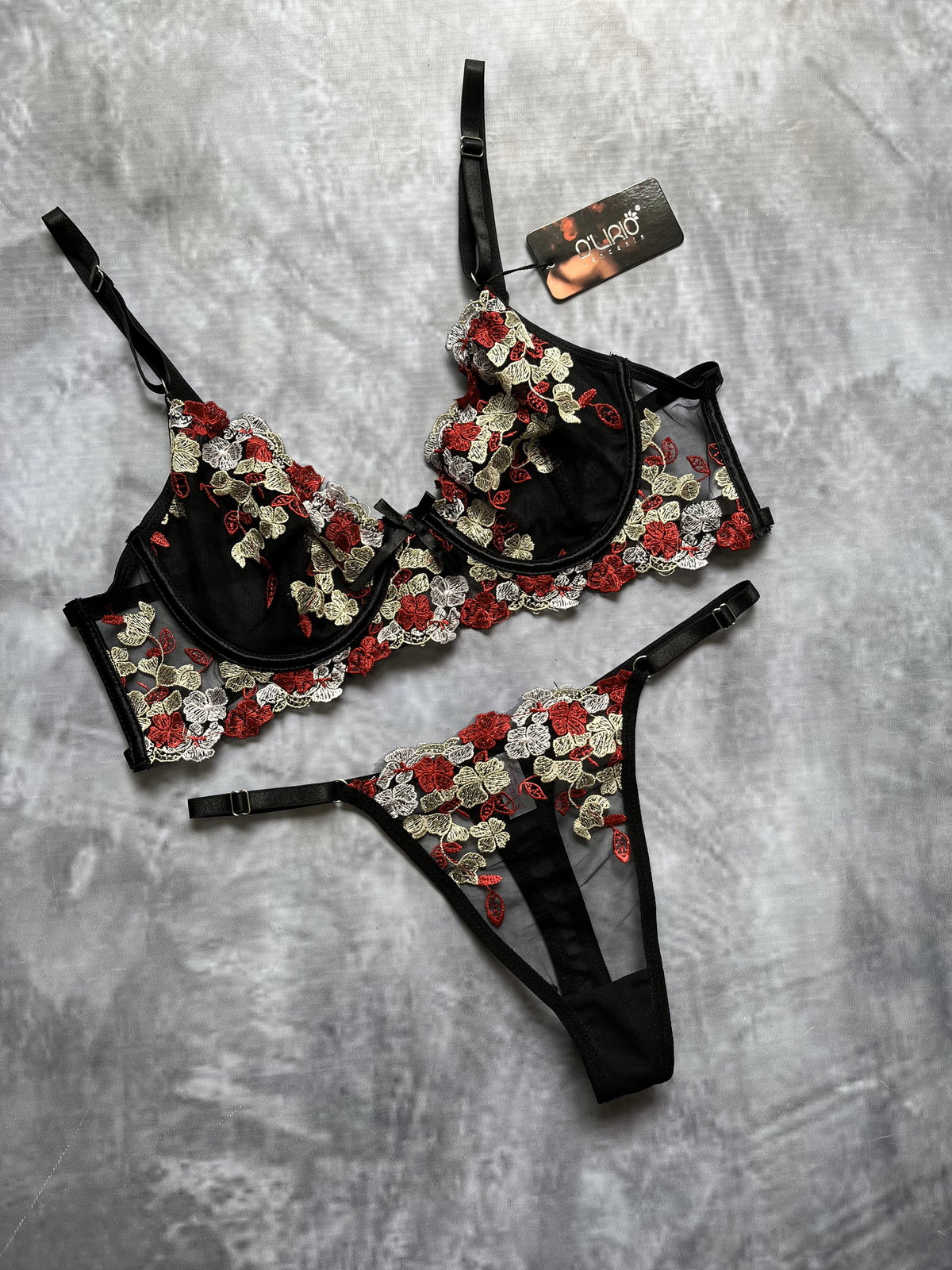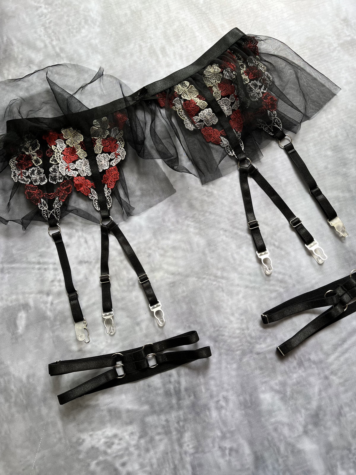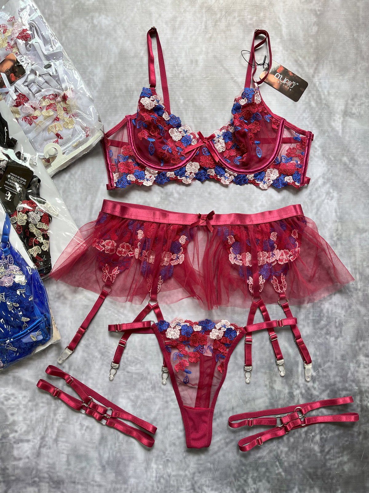 CONJUNTO DE TUL BORDADO CON FLORES, corpiño y colaless también viene con el porta liga doble con pollerita