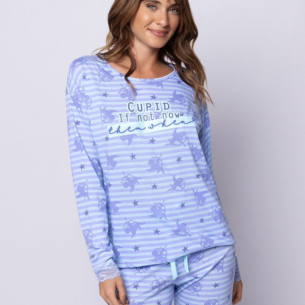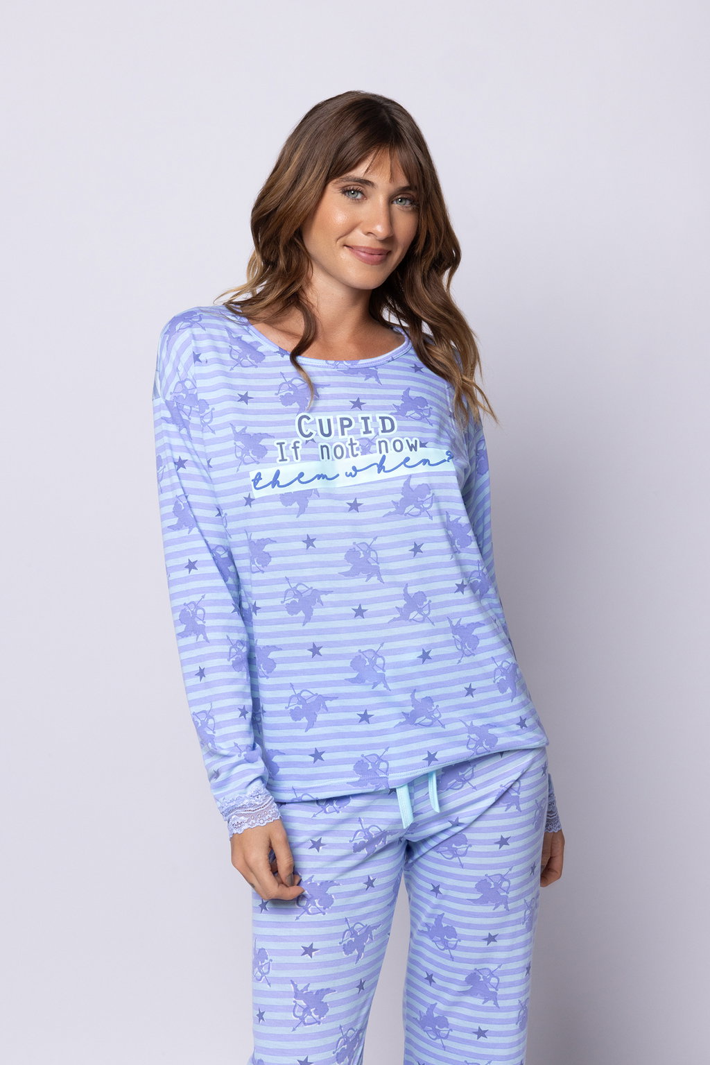 Pijama de dos piezas, con detalles de puntilla en la manga y en la botamanga.
