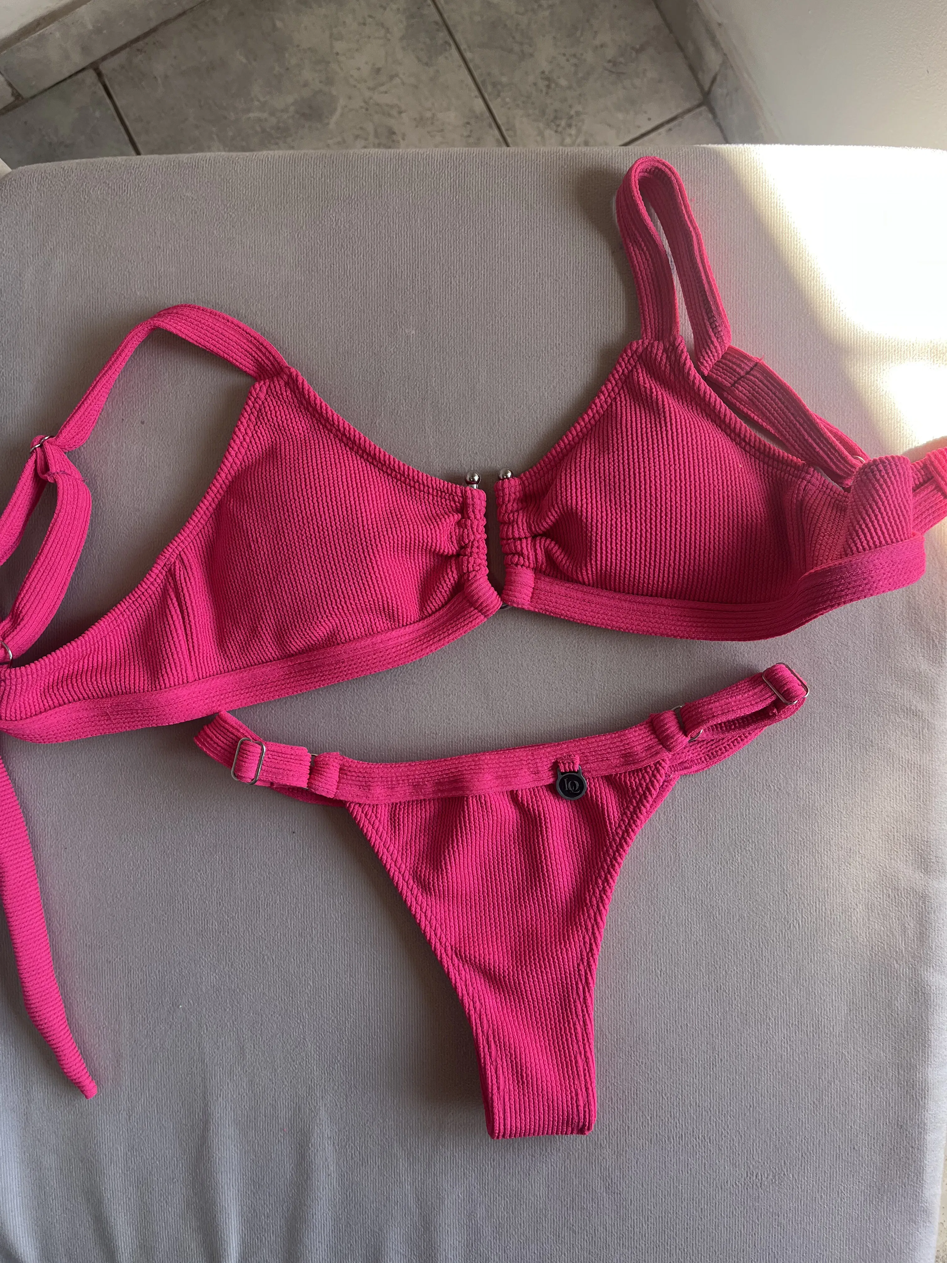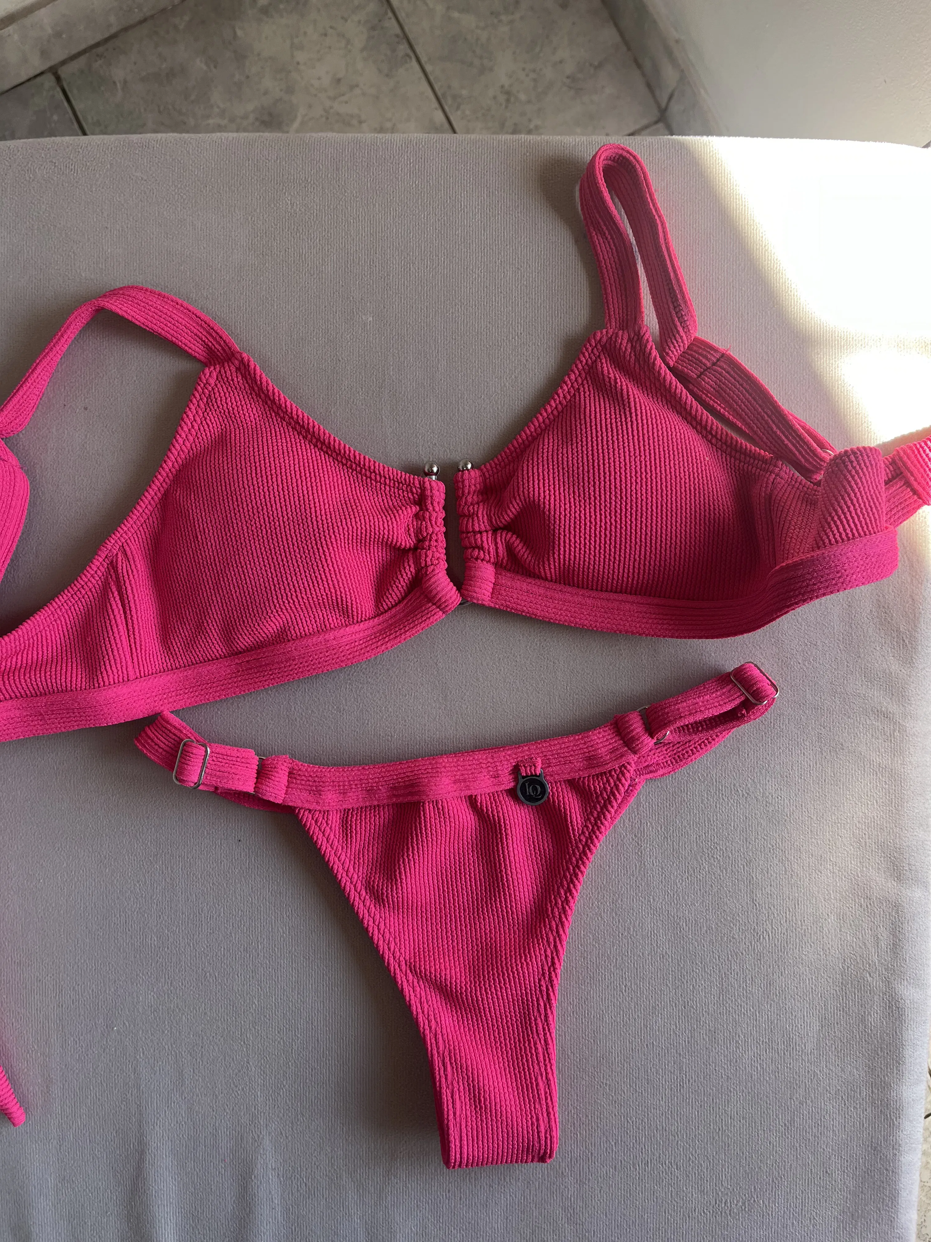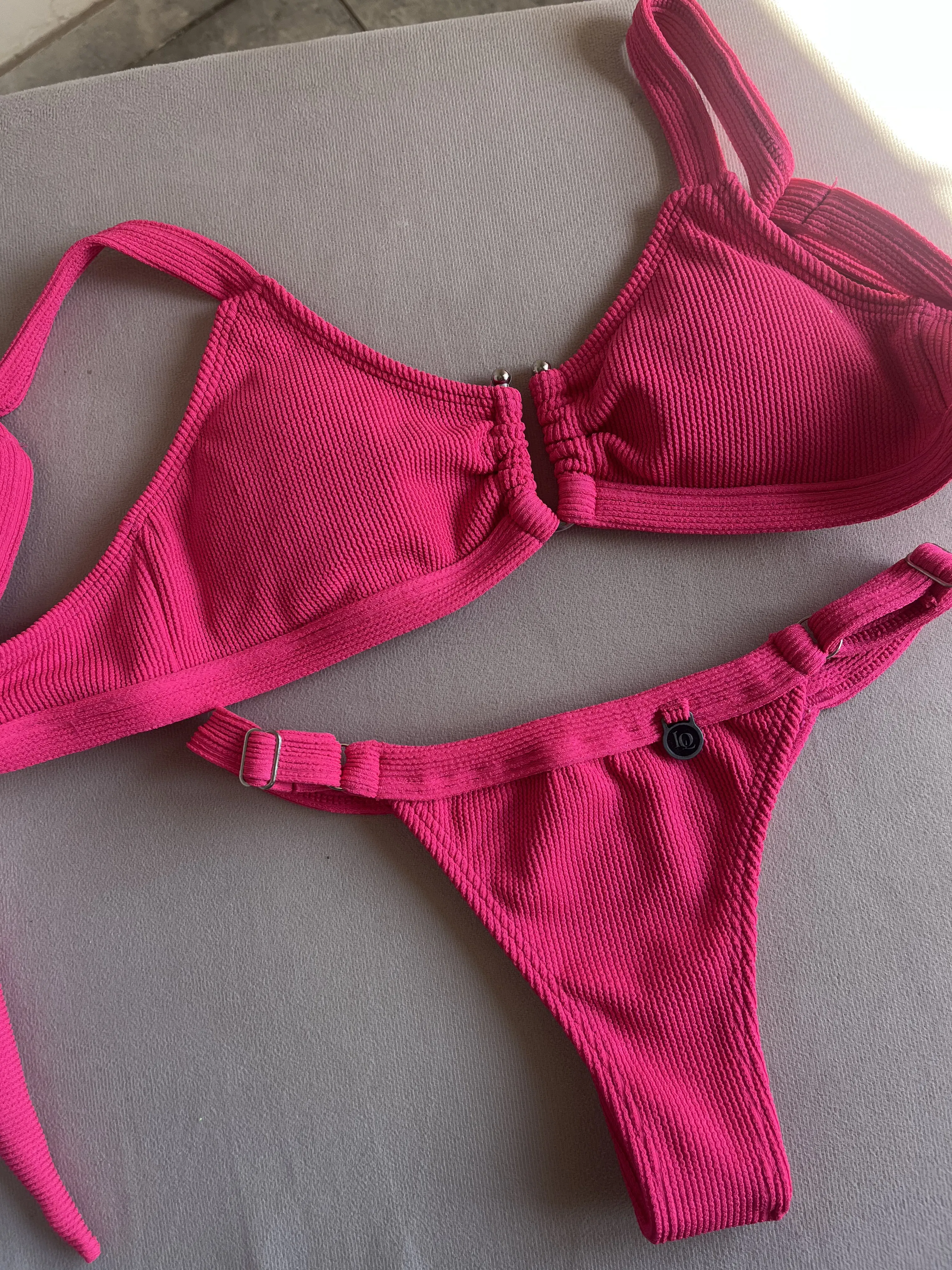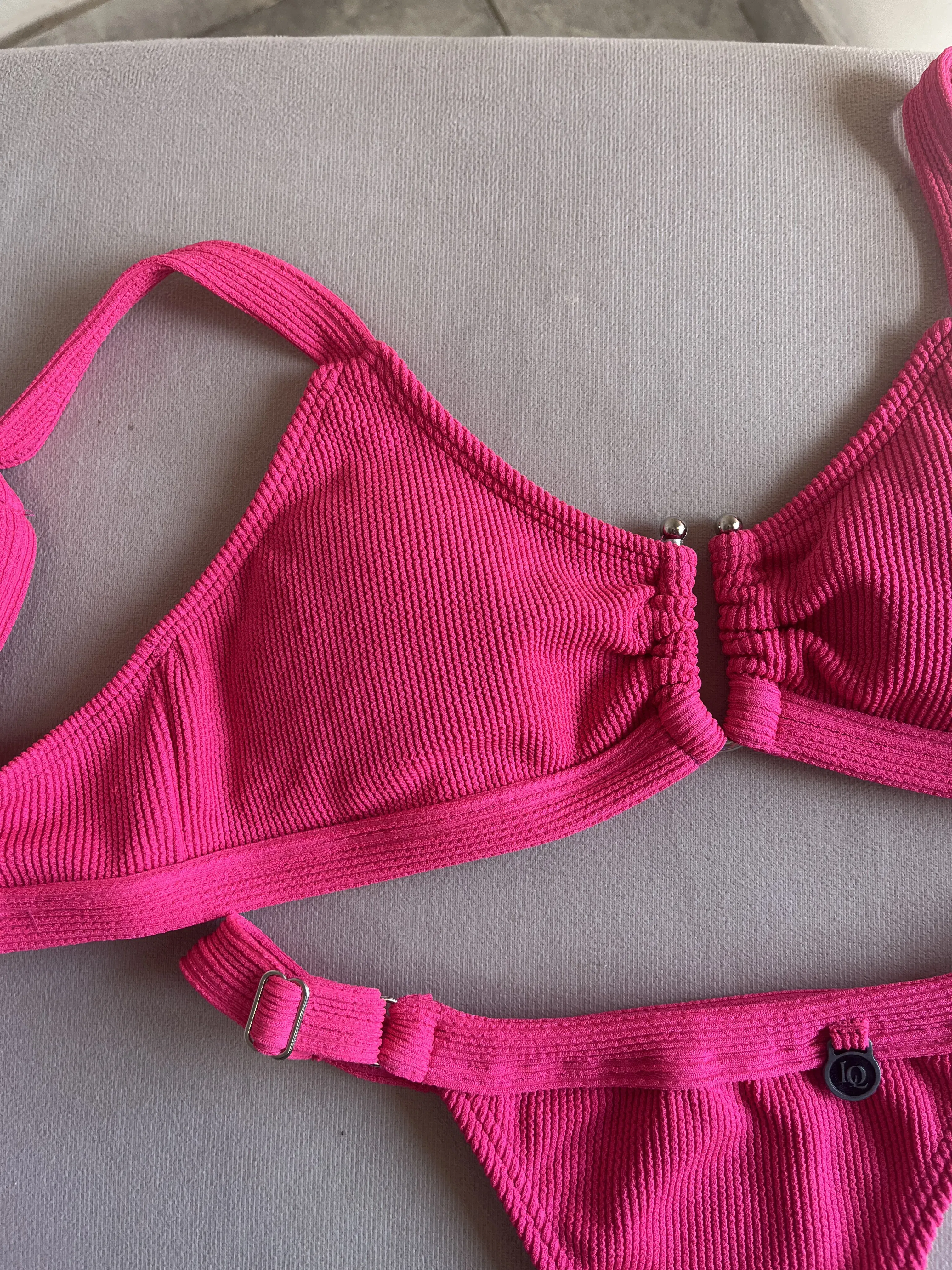 Top texturado con herraje, breteles regulables y espalda para atar. Colaless regulable