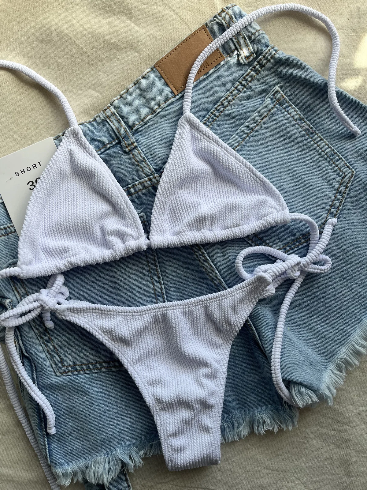 Corpiño triangulo con bolsillo para ponerle tazas y colaless para atar