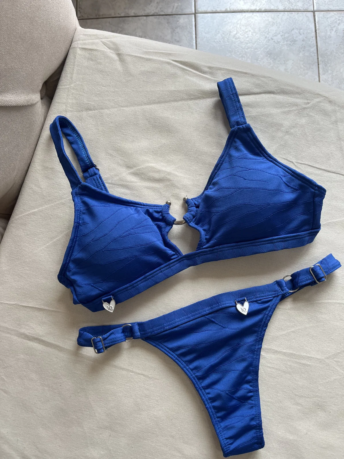 Top texturado vivorita con herraje, breteles regulables y espalda para atar. Colaless regulable