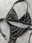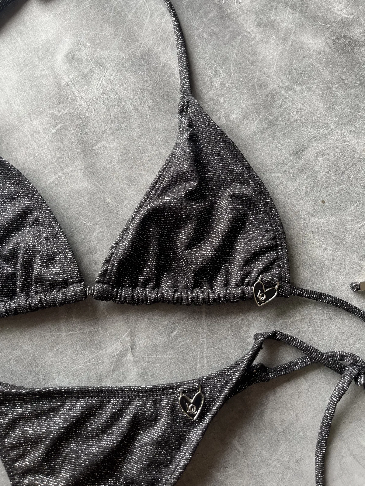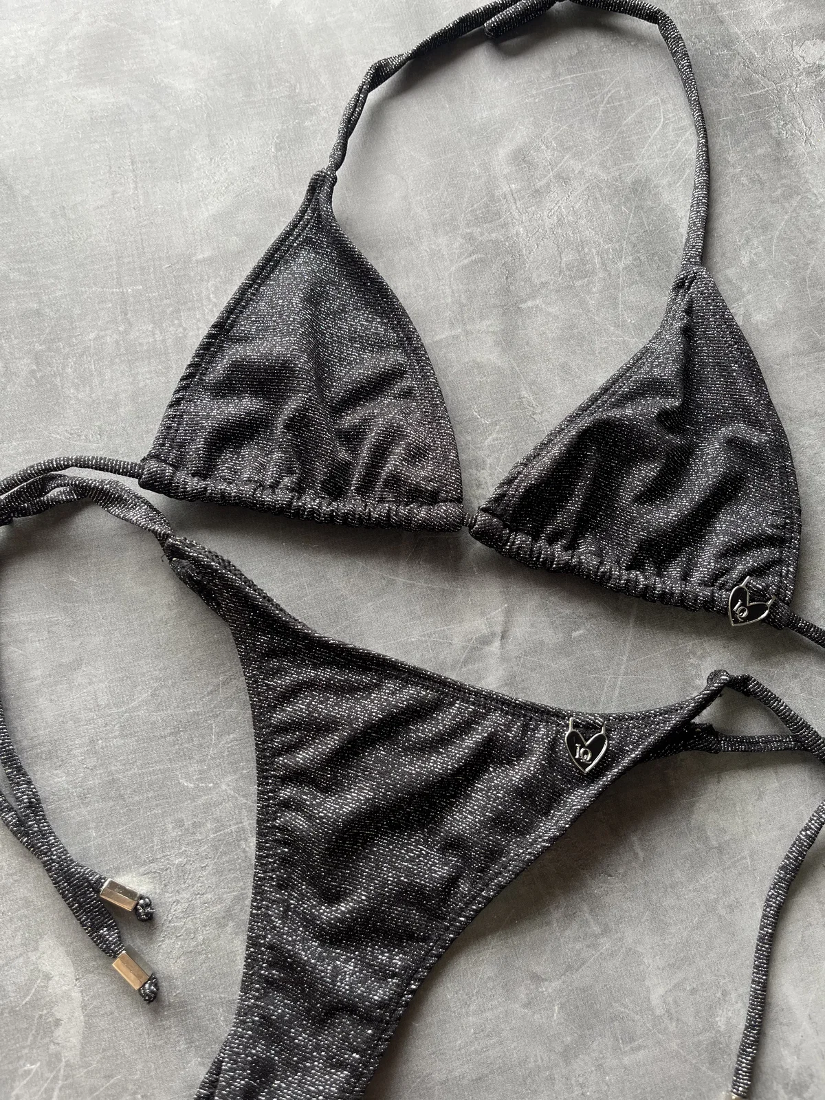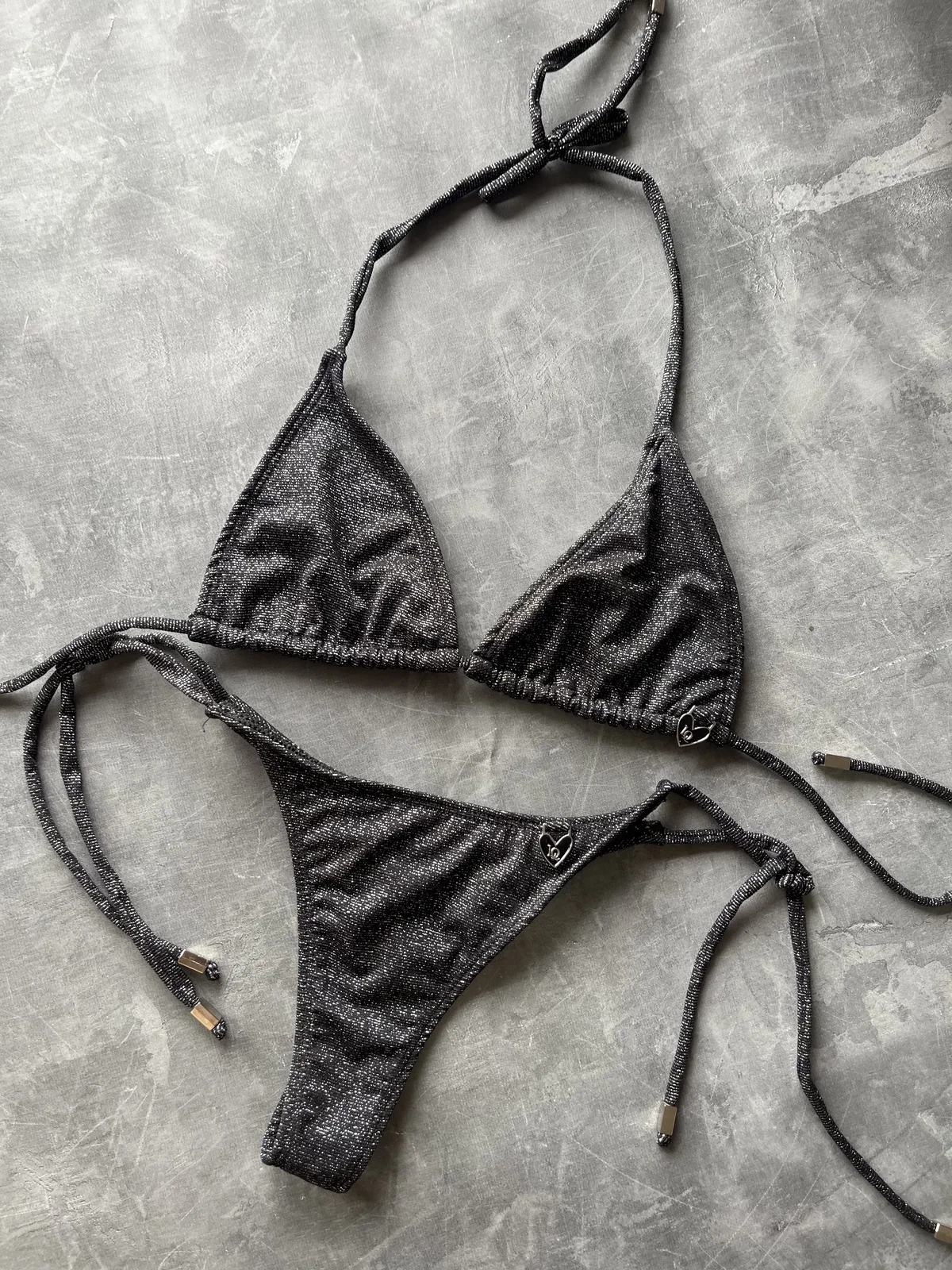 Triángulo de glitter y tiras para atar , colaless para atar . Terminales metálicas en todas sus tiras y chapita en corpiño y bombo.