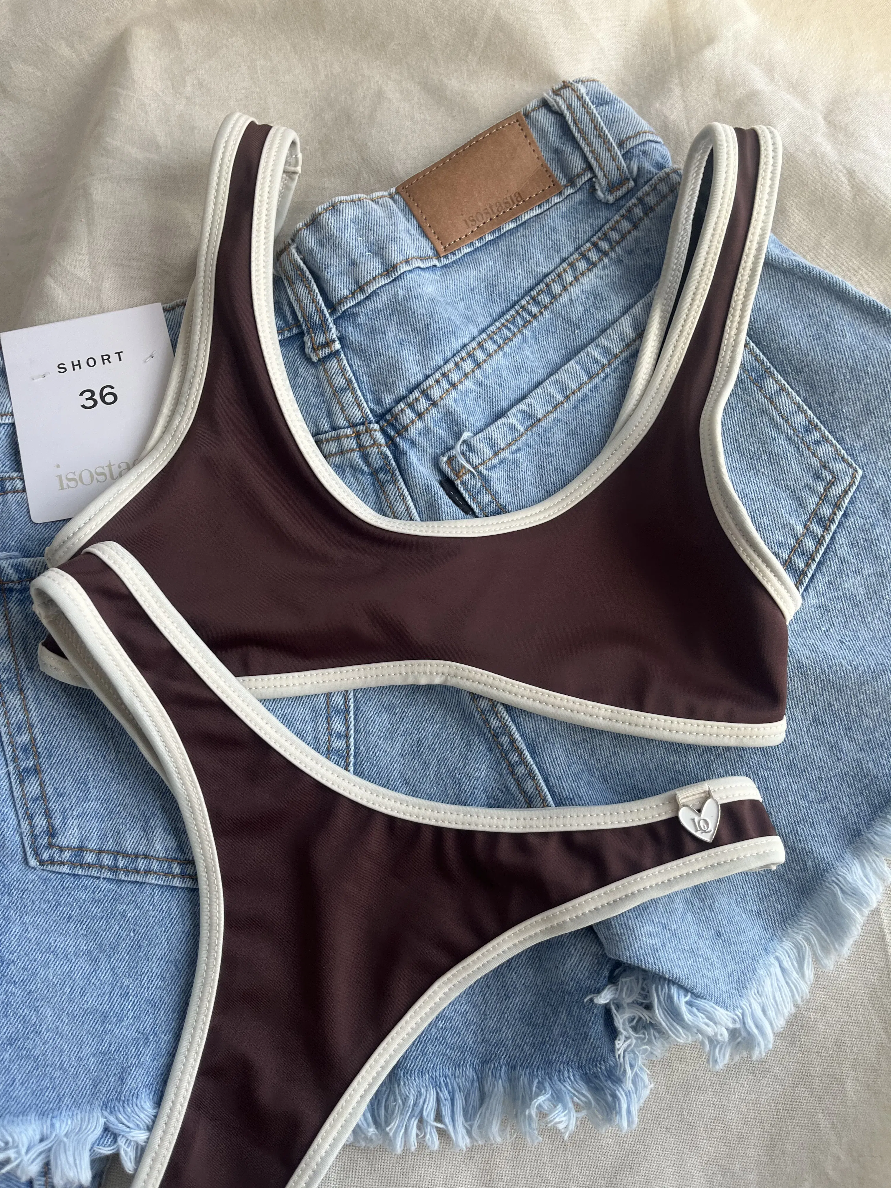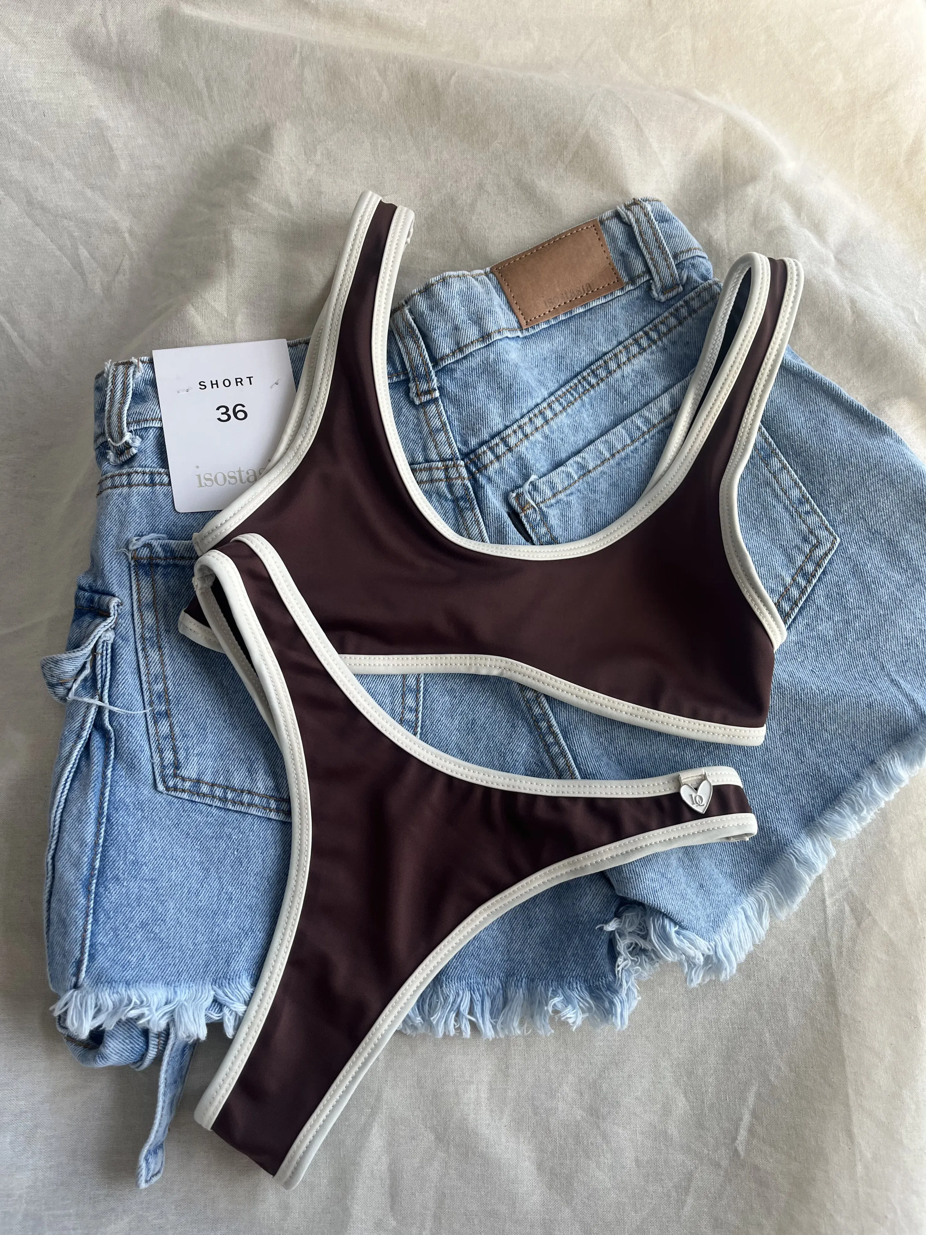 Top entero y bombacha colaless con vivo crema. Corpiño con doble forreria y abertura para poner rellenitos