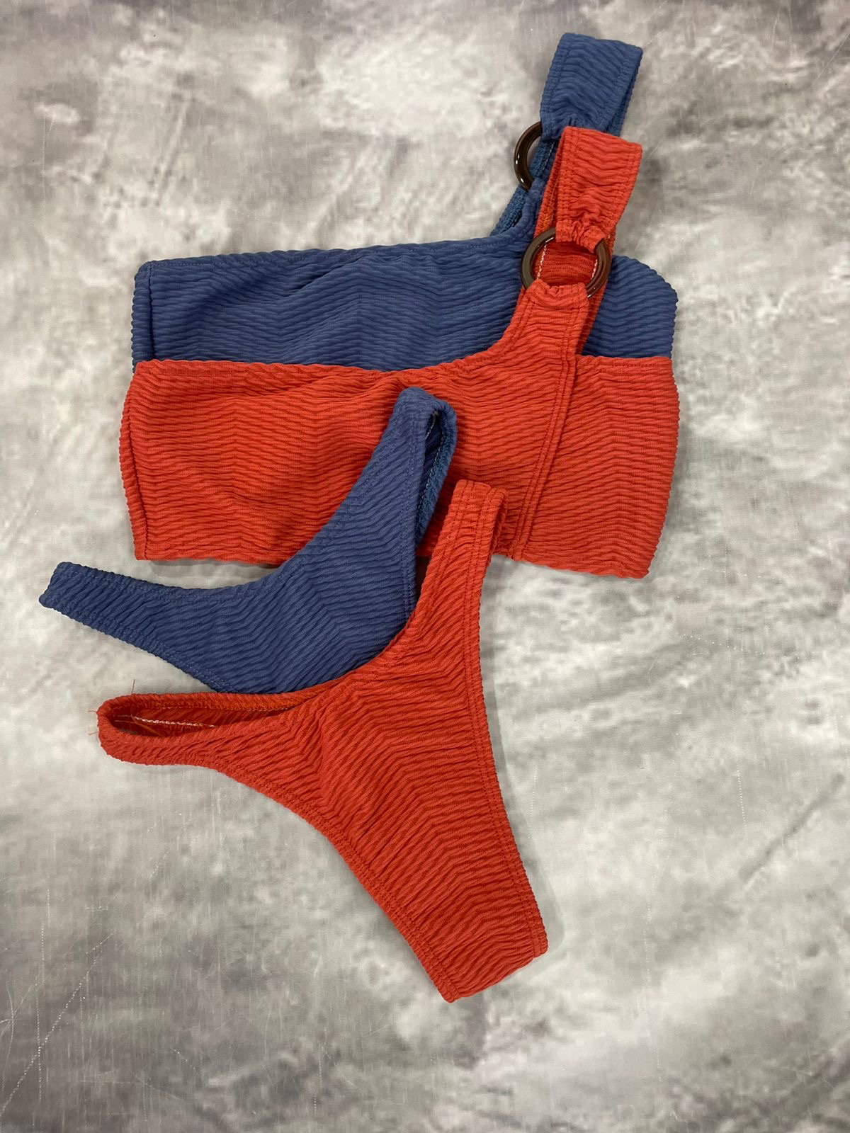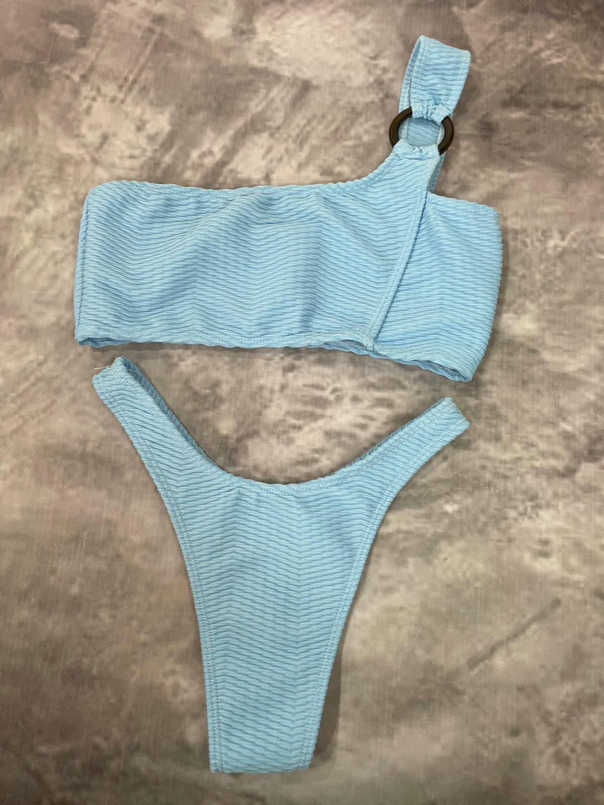 Biniki texturada,top de un hombro con detalle de argolla y less corte en V FRIDA