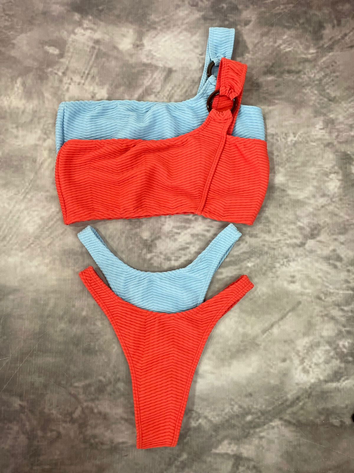 Biniki texturada,top de un hombro con detalle de argolla y less corte en V FRIDA