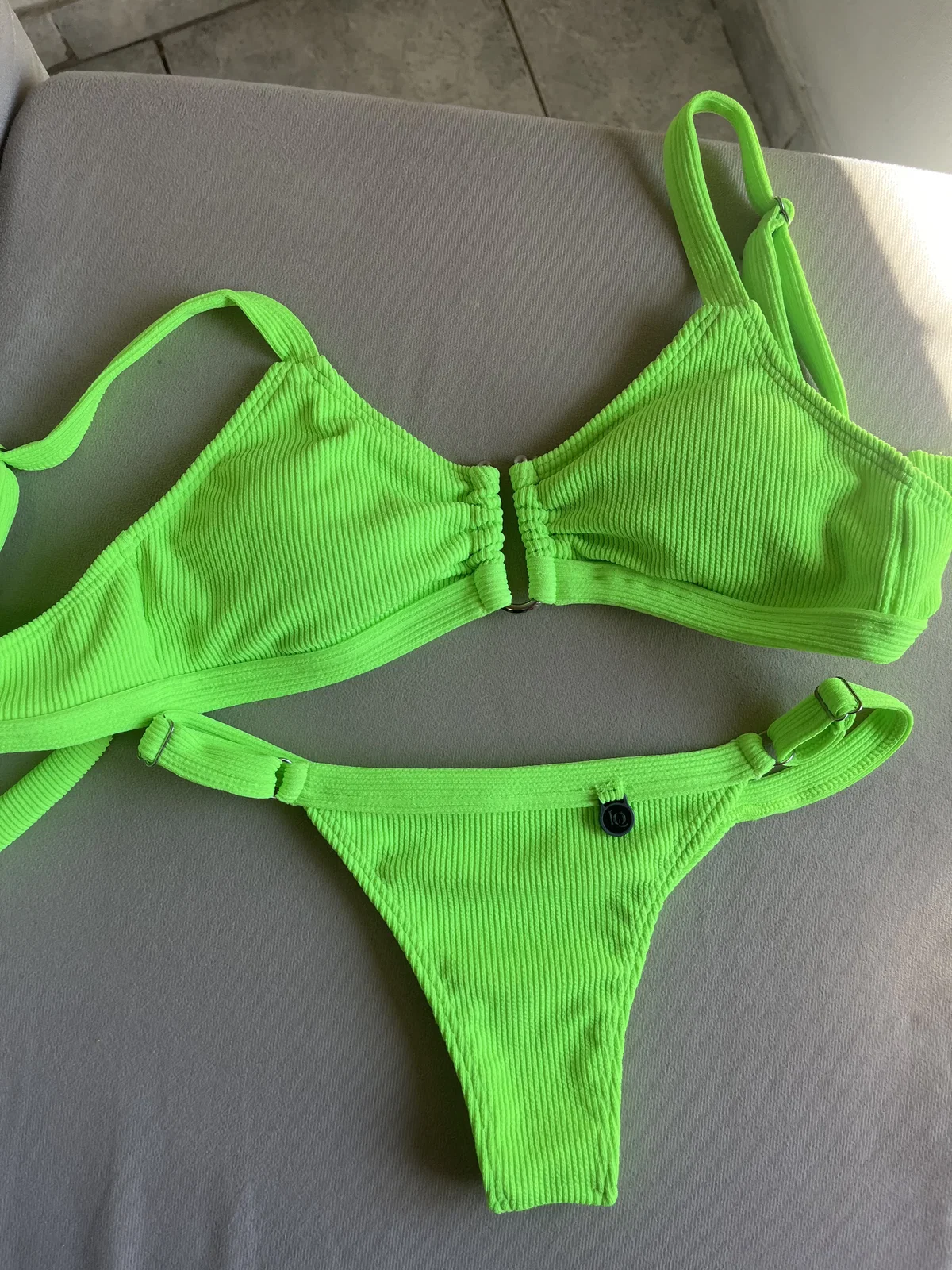 Top texturado con herraje, breteles regulables y espalda para atar. Colaless regulable